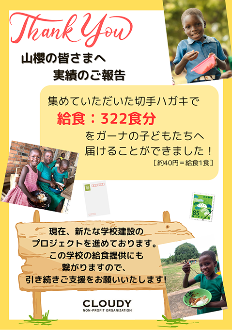 書き損じはがきや未使用のはがき・切手などを寄付することで、アフリカ・ガーナの子どもたちに給食を届ける、NPO法人CLOUDYの取り組みに参加しています。