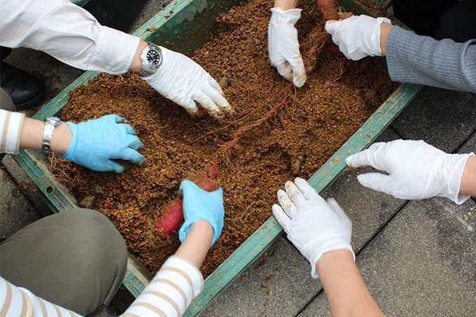 土から芋を掘り出す作業はまるで宝探しのようでワクワク。小さかったり細長かったりする不格好な芋もなんだか愛しく思えます。普段の業務とはかけ離れた都会での芋ほり体験は想像以上に楽しく、バスツアーでまた行こうと言い出す社員までいました。