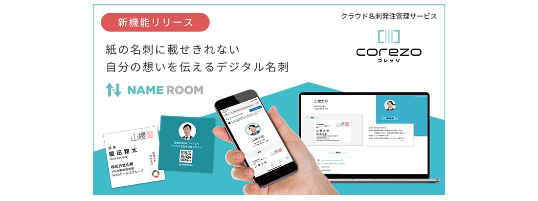 ・デジタル名刺管理サービス「NAME ROOM」サービス紹介ページ:https://service.corezo.yamazakura.jp/nameroom